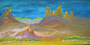 Though he painted with acrylics, the colours were arranged like a classic watercolour palette. These were applied as washes before thicker impasto paint was added. Soft pinks, golden yellows, bright oranges, velvet purples, and deep browns were used to create landforms and features. He whipped up skies and laid down slopes and escarpments with fluid single movements