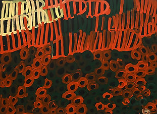 Indeed the comparison between the two women, who were sisters-in-law, extended to their fundamental feelings 'of reverence, abandon… intuition-minimal fuss,' as Sydney abstractionist Tony Tuckson phrased it (cited in McCulloch 2003). The manner in which they created their works appeared to be the result of an urgency to reconnect to the past and to keep the Dreaming a living reality. Just like Emily Kngwarreye before her, in painting after painting Minnie boldly and self-assuredly depicted the body designs painted on to women’s breasts and limbs for the regular ceremonial revivification of her country. While the rambling tuberous roots of the Yam or Bush Potato were Emily’s Dreamings and the subject of her art, Minnie’s primary focus was the Bush Melon and its seeds. Her Awelye-Antnwengerrp paintings drew directly from these ceremonial practices, depicting bush melon, seed, and breast designs in powerful multi-coloured brushstrokes that built in to a structured patchwork of luminous colour most often emanating from within a darker under-layer. The energy of these vibrant colourful works seemed to capture the joy of coming across these sweet bush foods, now scarce and difficult to find.