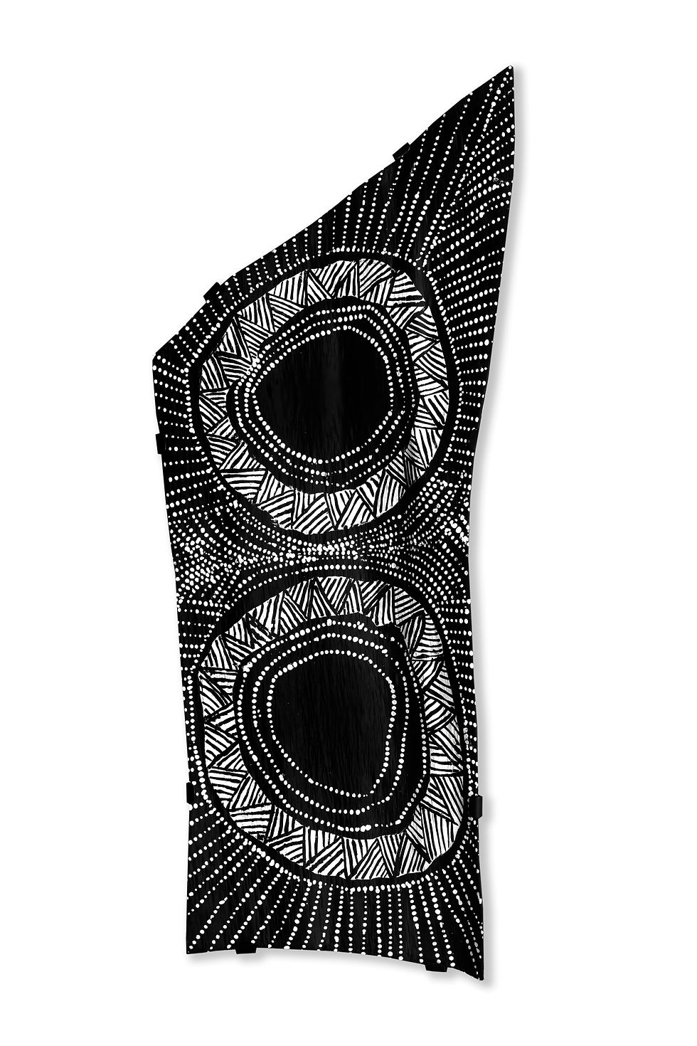 "In Gardiya (whitefella) way, this the pastoral lease that runs right back near Deford Downs. This is the cattle country from Bow River. My family used to do mustering around here. That is where they put the panel yards for the cattle to go in. It is near the banks of the river. This country is called Pelican Hole (black fella name Jumulygung) - this is my gully gully (great grandmother's) country. It also belongs to my mother Mona Ramsey. The water around these black ranges is emerald green and has blue hills. Also there is a lot of black bream, turtles, water goannas and crocodiles." Kathy Ramsey